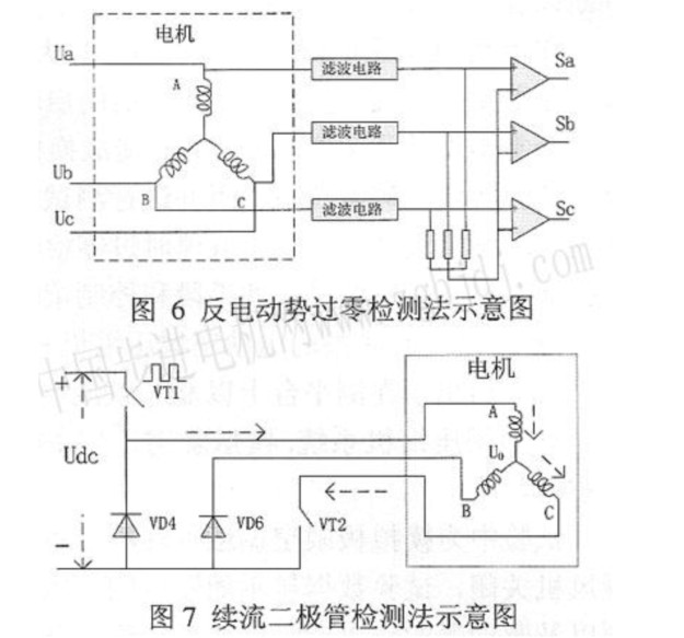 無位置傳感器的實(shí)現(xiàn)方法,國內(nèi)外己經(jīng)做了很多的研究,并且也提出了許多不同的解決方法,如反電勢(shì)檢測(cè)法、續(xù)流二極管法、三次諧波法、渦流效應(yīng)法、電感法、模糊控制和神經(jīng)網(wǎng)絡(luò)控制法等等。就實(shí)際情況來看,前三種方法的應(yīng)用比較廣泛,這里進(jìn)行簡單的比較。  反電勢(shì)檢測(cè)法最早是上世紀(jì)80年代由日本學(xué)者提出,是一種比較實(shí)用的無位置檢測(cè)控制方案。對(duì)于三相永磁無刷直流電機(jī),只需要六個(gè)關(guān)鍵的轉(zhuǎn)子位置就能夠順利換相。轉(zhuǎn)子旋轉(zhuǎn)時(shí)會(huì)在定子中感應(yīng)出反電動(dòng)勢(shì),所以設(shè)法得到定子的反電動(dòng)勢(shì)波形,就能夠估算出轉(zhuǎn)子的實(shí)際位置。  圖6是一種反電動(dòng)勢(shì)過零檢測(cè)法的示意圖。由于電機(jī)的中性點(diǎn)一般不引出,所以用三個(gè)星形連接的電阻,模擬中性點(diǎn)。經(jīng)過比較器可以得到,換相所需的6個(gè)反電勢(shì)的過零點(diǎn),經(jīng)過一定的處理,可以獲得所需的換相時(shí)刻。  反電勢(shì)檢測(cè)法的優(yōu)點(diǎn)是,硬件電路結(jié)構(gòu)簡單,成本低,容易實(shí)現(xiàn)。缺點(diǎn)是,PmI斬波以及二極管的續(xù)流等信息都會(huì)包含在檢測(cè)信號(hào)中,干擾嚴(yán)重。同時(shí),隨著速度的變化,濾波電路引起的相移與實(shí)際換相需求正好相反,容易造成換相失敗。
