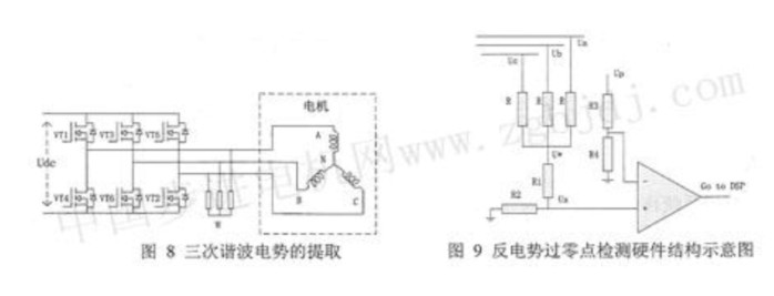 續(xù)流二極管法,是一種通過檢測(cè)非導(dǎo)通相續(xù)流二極管的通斷狀況來判斷反電勢(shì)過零點(diǎn)的一種方法。 如圖7所示,當(dāng)vTl、vT2導(dǎo)通時(shí)中性點(diǎn)電壓U0為Udc/2,而當(dāng)VTl斬波關(guān)斷時(shí),U0約為0,于是VTl關(guān)斷期間,vD6陰極的電壓基本上能反匝B相的反電動(dòng)勢(shì)。于是當(dāng)B相的反電動(dòng)勢(shì)E00000000的狀態(tài)從>O變?yōu)?lt;0時(shí),vD6的導(dǎo)通狀態(tài)會(huì)將由關(guān)斷變?yōu)閷?dǎo)通,反之亦然。所以,在斬波控制的VTl關(guān)斷期間檢測(cè)VD6的變化,獲得vD6的****狀態(tài)變化點(diǎn),就能獲得反電動(dòng)勢(shì)的過零點(diǎn)。  由于二極管比較低的導(dǎo)通壓降,所以這種方法在反電動(dòng)勢(shì)較低時(shí),也能使用,這樣就擴(kuò)大了調(diào)速范圍,但是其缺點(diǎn)也是很明顯。比如,需要復(fù)雜的檢測(cè)電路、特殊的PwM控制方法,干擾嚴(yán)重等。  三次諧波檢測(cè)法,是指通過檢測(cè)反電勢(shì)三次諧波分量的過零點(diǎn)來判斷轉(zhuǎn)子的位置。三次諧波電勢(shì)一般需要從星形電阻網(wǎng)絡(luò)的中心點(diǎn)M和三相電機(jī)繞組的中心Ⅳ的提取。如圖8所示。顯然,由于需要引出電機(jī)的中性點(diǎn),這大大限制了三次諧波法的使用,同時(shí),對(duì)電機(jī)也有一定的要求,比如,電機(jī)要有比較大的三次諧波分量、三相繞組對(duì)稱等。但三次諧波法也有很明顯的優(yōu)點(diǎn),PwM斬波控制和二極管續(xù)流都不會(huì)形成干擾。 圖9給出了實(shí)際試驗(yàn)測(cè)試中所使用的一種反電動(dòng)勢(shì)過零點(diǎn)檢測(cè)法的硬件圖。從原理圖可見,