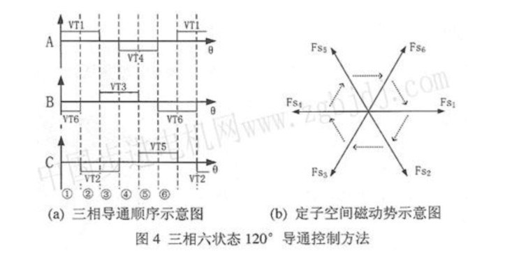 在電動(dòng)空調(diào)Ecu方面,主要有二種解決方案,一是全硬件的無刷直流電機(jī)的驅(qū)動(dòng)電路,這種方案的系統(tǒng)響應(yīng)快,電路結(jié)構(gòu)簡單,但電路功能有限,可擴(kuò)展性和通用性較差。目前在電動(dòng)空調(diào)上的趨勢(shì)是采用基于DsP或微處理器的控制電路,實(shí)現(xiàn)對(duì)電機(jī)的控制和調(diào)速,系統(tǒng)的靈活、可適用性強(qiáng),同時(shí)也使一些高性能的先進(jìn)控制策略的實(shí)現(xiàn)成為可能。  對(duì)于圖3所示的三相永磁電動(dòng)機(jī),常采用三相六狀態(tài)120o導(dǎo)通的控制模式。這種控制模式具有平均轉(zhuǎn)矩大,轉(zhuǎn)矩脈動(dòng)小,電流利用率高等特點(diǎn)。圖4給出了在這種控制模式下的三相導(dǎo)通順序圖以及相對(duì)應(yīng)的定子空間磁動(dòng)勢(shì)矢量示意圖。