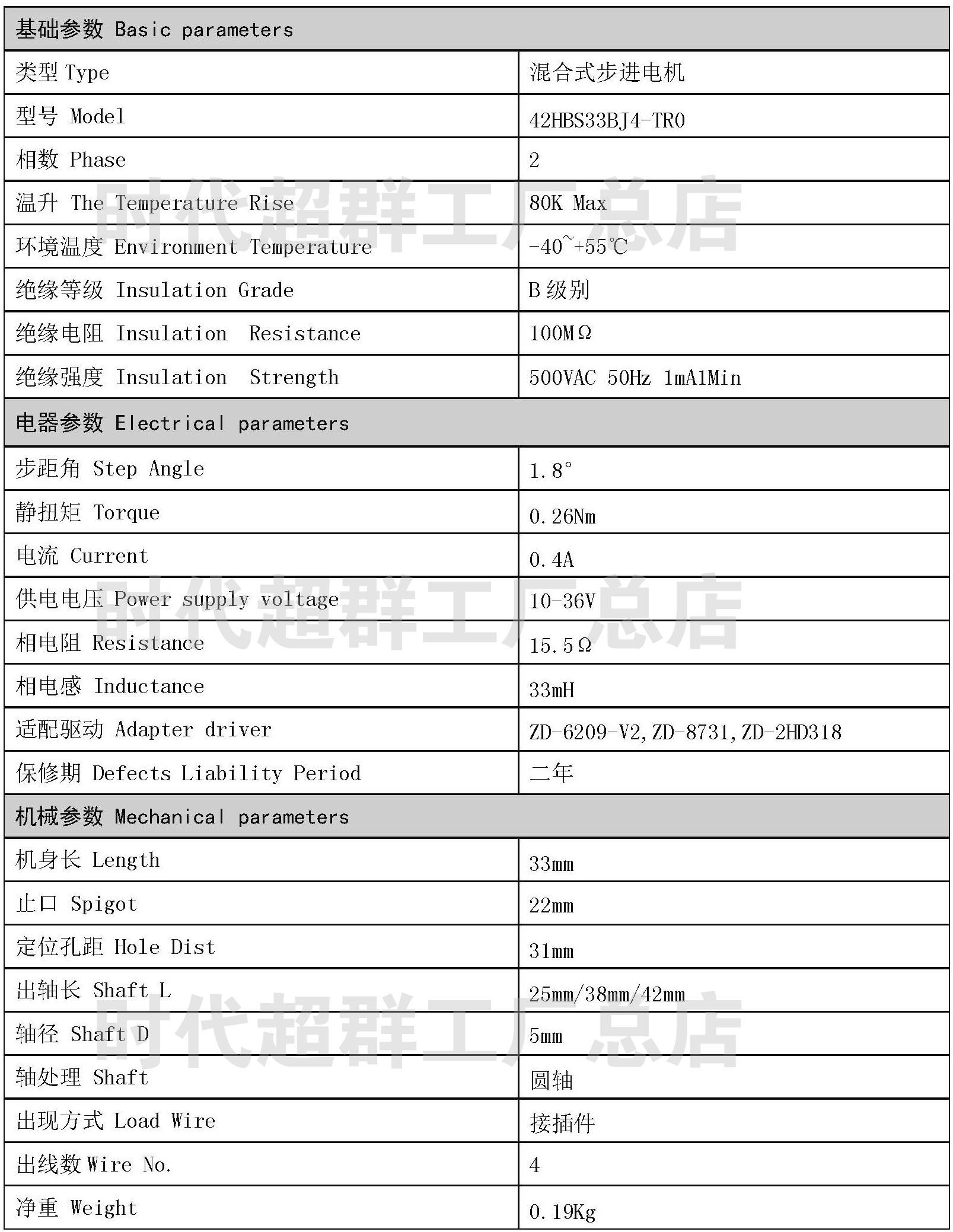 型號:42HBS33BJ4-TR0兩相混合式步進電機,機身高33MM,扭矩0.26N.m,電流0.4A,軸徑Φ5MM,圓軸,軸長25mm,可根據(jù)客戶要求定制,廣泛適用范圍于激光、醫(yī)療、紡織、安防等行業(yè)。 產(chǎn)品細節(jié)圖