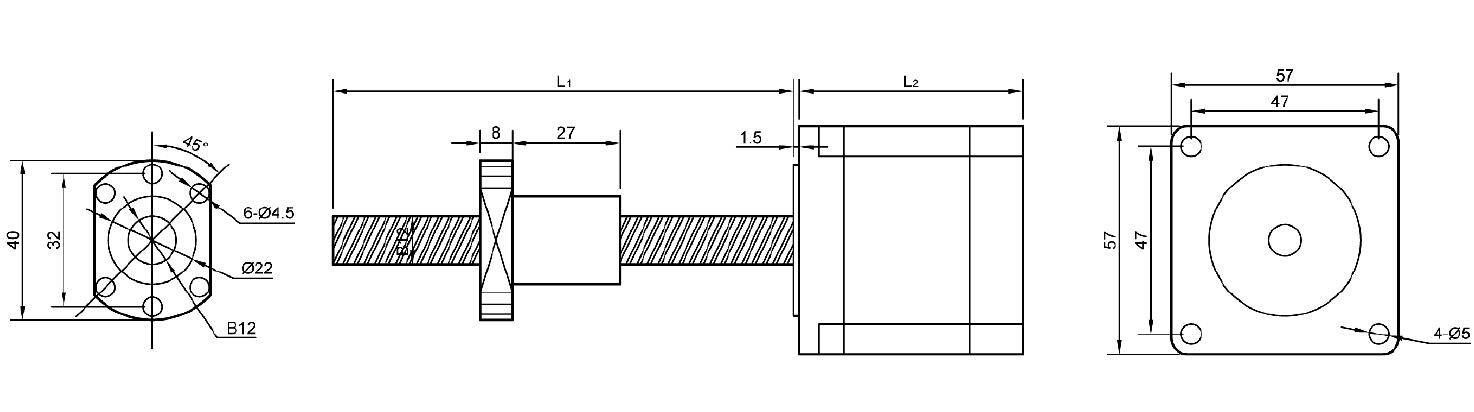 上圖為梯形絲桿直線(xiàn)電機(jī)為57B76AT0808D-20,電機(jī)靜扭矩1.5NM,電流3A,機(jī)身長(zhǎng)76,止口38MM,孔距47MM,有效行程200MM,導(dǎo)程為8MM,直徑為8MM,電機(jī)結(jié)構(gòu)簡(jiǎn)單、反應(yīng)速度快、靈敏度高、隨動(dòng)性好、密封性好、不怕污染、適應(yīng)性強(qiáng),和控制系統(tǒng)相配合,可做到0.001mm的位移精度和自鎖能力。直線(xiàn)電機(jī)的絲杠部分可根據(jù)客戶(hù)要求的