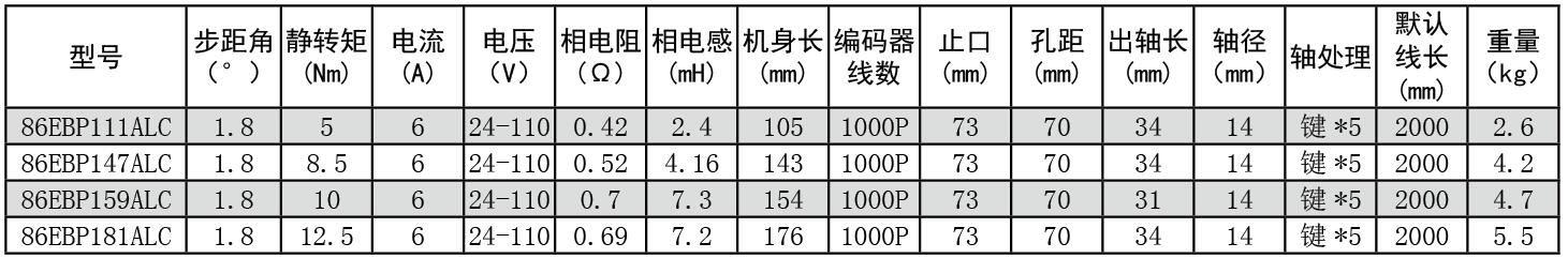86系列全數(shù)字閉環(huán)高速大扭矩伺服步進套裝 編碼器電機86EBP111ALC-TK0靜轉(zhuǎn)矩5.0Nm,編碼器1000P。編碼器線長和電機線長為2000mm。電流范圍0~6A,電壓范圍AC18~80V/DC24~110V。