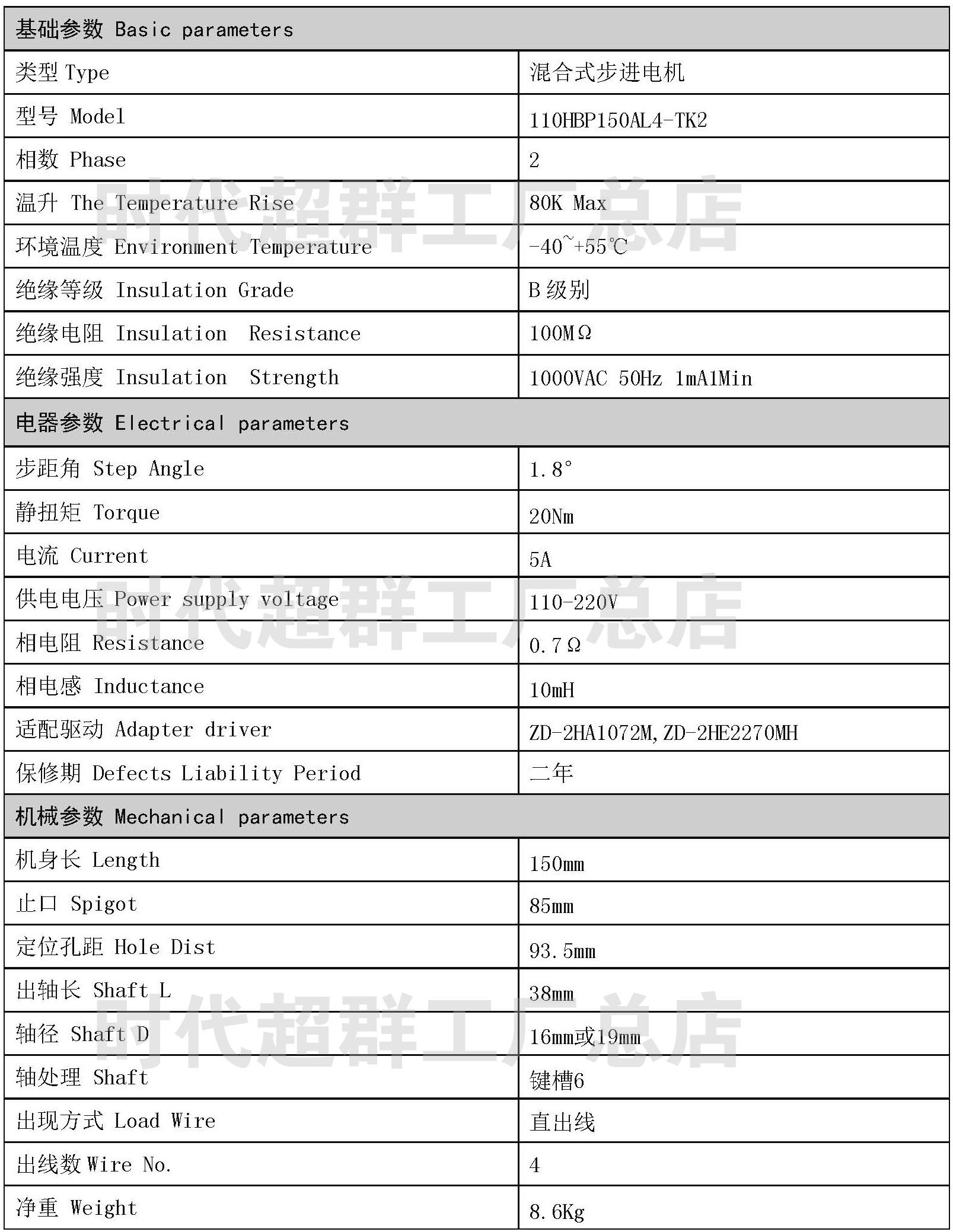 型號 Model | 老型號 old Model | 相數(shù) Phase | 步距角 Step Angle | 靜轉(zhuǎn)矩 Torque (Nm) | 電流 Current (A) | 相電阻 Resistance (Ω) | 相電感 Inductance (mH) | | 110HBP115A4-TK0 | 110BYG250-115 | 2 | 1.8° | 17.5 | 4.4 | 0.6 | 20 | | 110HBP150A4-TK2 | 110BYG250-150軸19 | 2 | 1.8° | 20 | 5 | 0.7 | 10 | | 110HBP150A4-TK0B | 110BYG250-150剎車 | 2 | 1.8° | 20 | 5 | 0.7 | 10 | | 110HBP165A4-TK0 | 110BYG250-165 | 2 | 1.8° | 24 | 5 | 0.7 | 21