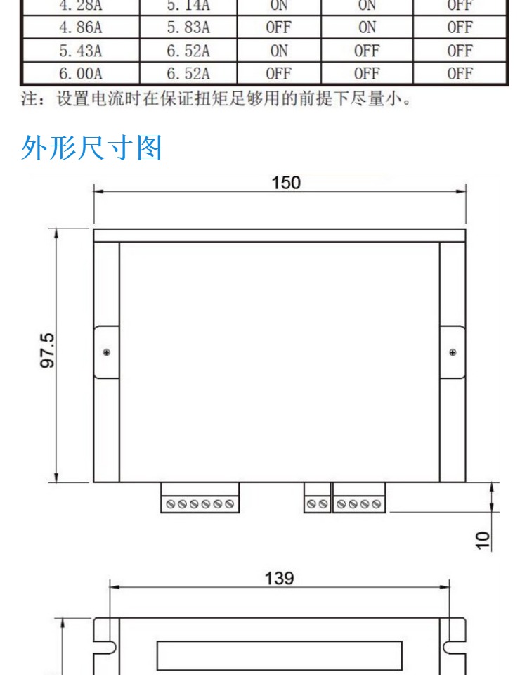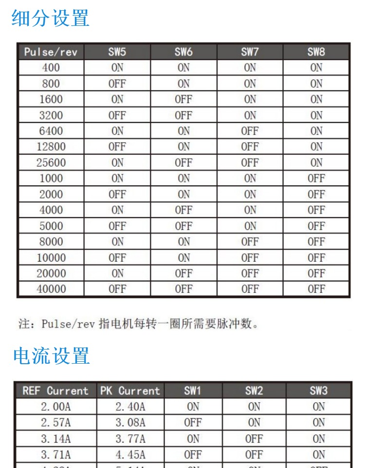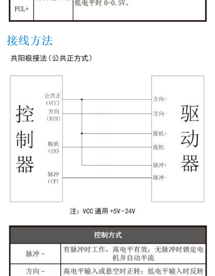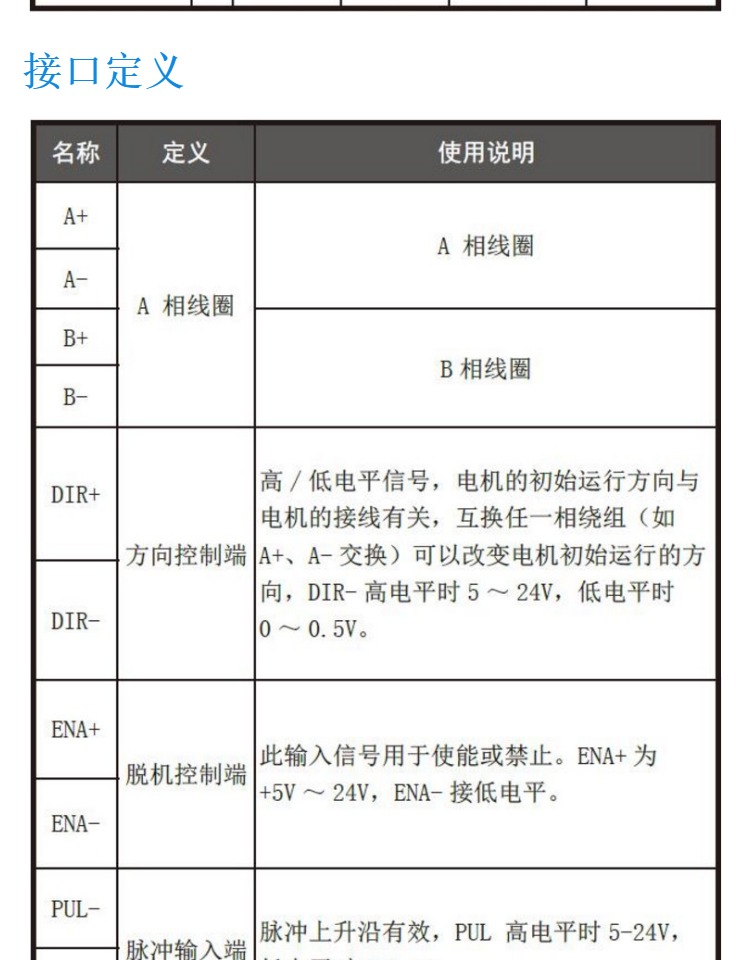 步進(jìn)電機(jī)驅(qū)動(dòng)器的電流 電流是判斷步進(jìn)電機(jī)驅(qū)動(dòng)器能力的大小,是選擇驅(qū)動(dòng)器的重要指標(biāo)之一,通常驅(qū)動(dòng)器的****電流要略大于電機(jī)標(biāo)稱電流,通常驅(qū)動(dòng)器有2.0A、3.5A、6.0A、8.0A等規(guī)格。 步進(jìn)電機(jī)驅(qū)動(dòng)器供電電壓 供電電壓是判斷驅(qū)動(dòng)器升速能力的標(biāo)志,常規(guī)電壓供給有:24VDC、40VDC、80VDC、110VAC等。 步進(jìn)電機(jī)驅(qū)動(dòng)器的細(xì)分 細(xì)分是控制精度的標(biāo)志,通過(guò)增大細(xì)分能改善精度。細(xì)分能增加電機(jī)平穩(wěn)性,通常步進(jìn)電機(jī)都有低頻振動(dòng)的特點(diǎn),通過(guò)加大細(xì)分可以改善,使電機(jī)運(yùn)行非常平穩(wěn)。 控制信號(hào)接口說(shuō)明