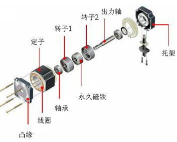 步進(jìn)電機(jī)的構(gòu)造如下圖所示,大致分為定子和轉(zhuǎn)子兩部分。轉(zhuǎn)子由轉(zhuǎn)子1、轉(zhuǎn)子2和****磁鋼組成。