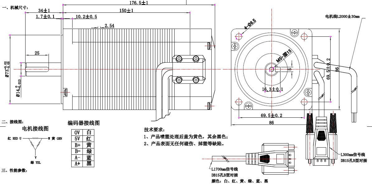 編碼器電機(jī)86ECP175ALC-TK0靜轉(zhuǎn)矩8Nm,編碼器1000P。編碼器線長和電機(jī)線長為2000mm。基本參數(shù)如下
