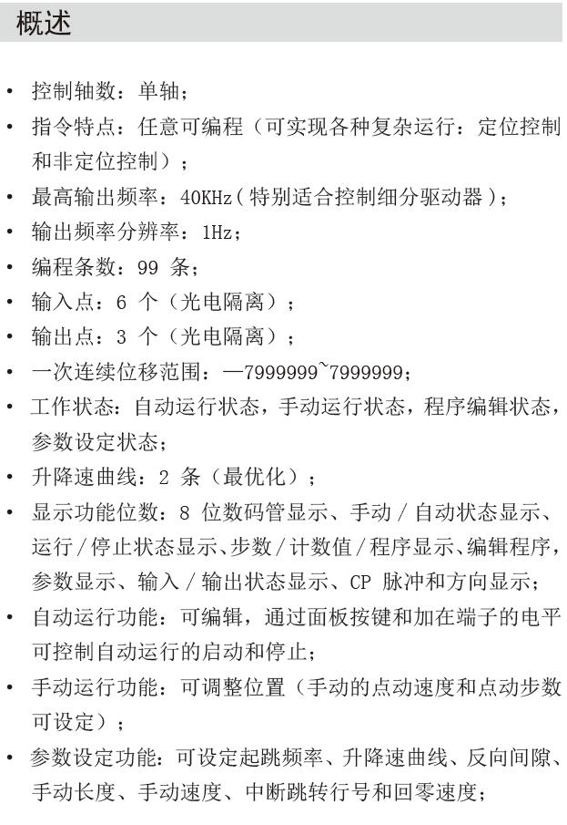 ·高性能、低價格、高速力矩大·****的相位記憶功能,重新上電后電機(jī)保持在定位角度·可針對不同電機(jī)調(diào)節(jié)電感量,發(fā)揮步進(jìn)電機(jī)****效能·脈沖平滑功能,使電機(jī)低速運(yùn)行更平穩(wěn),平滑等級可設(shè)定·接口采用超高速光耦隔離·抗高頻干擾能力強(qiáng) ·設(shè)有 16 檔等角度恒力矩細(xì)分,****分辨率 12000 脈沖 / 轉(zhuǎn),并可定制任意細(xì)分·****響應(yīng)頻率可達(dá) 150Kpps ·無脈沖輸入時,輸出電流自動降低(默認(rèn)為 50%,可任意調(diào)節(jié))·驅(qū)動電流:0.5—6.0A/ 相,16 檔可調(diào)·信號電平 5 ~ 24V 兼容·支持脫機(jī)、使能、鎖定等功能 ·接口定義