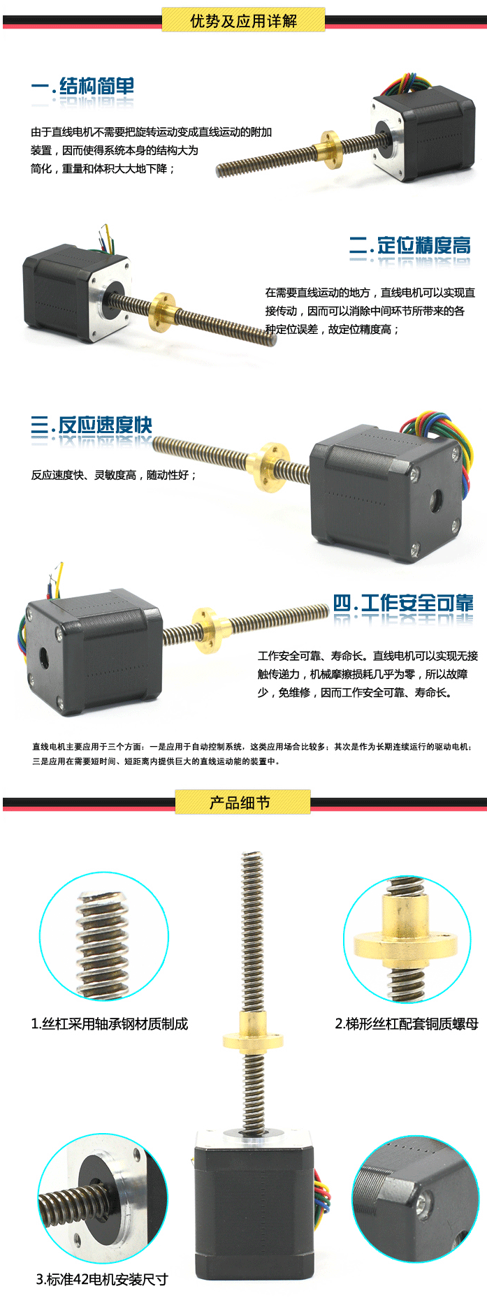 上圖為時(shí)代超群梯形絲桿直線電機(jī)為42B40AT0808D-10,電機(jī)靜扭矩0.32NM,電流0.4A,機(jī)身長(zhǎng)40MM,絲桿長(zhǎng)100mm,電機(jī)結(jié)構(gòu)簡(jiǎn)單、反應(yīng)速度快、靈敏度高、隨動(dòng)性好、密封性好、不怕污染、適應(yīng)性強(qiáng),和控制系統(tǒng)相配合,可做到0.001mm的位移精度和自鎖能力。直線電機(jī)的絲杠部分可根據(jù)客戶(hù)要求的 軸徑、軸長(zhǎng)、導(dǎo)程、絲杠的類(lèi)型(滾珠、T型絲杠)等定制。
