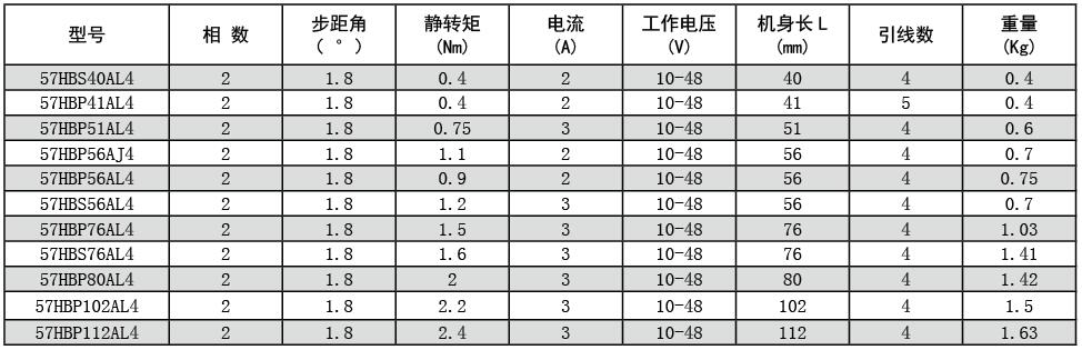 | 型號 | 步距角 | 靜轉矩 Nm | 電壓VDC | 電流 A | 軸長 mm | 軸徑 mm | 重量 kg | | 42HBS33BJ4-TR0 | 1.8 | 0.21 | 12 | 0.4 | 22 | 5 | 0.2 | | 42HBS33BJ4-TR1 | 1.8 | 0.21 | 12 | 0.4 | 38 | 5 | 0.2 | | 42HBS33BJ4-TR2 | 1.8 | 0.21 | 12 | 0.4 | 42 | 5 | 0.2 | | 42HBS40BJ4-TR0 | 1.8 | 0.33 | 12 | 0.4 | 22 | 5 | 0.26 | | 42HBS40CJ4-TR0 | 1.8 | 0.33 | 12 | 0.4 | 22 | 5 | 0.26 | | 42HBS48BJ4-TR0 | 1.8 | 0.5 | 12 | 0.4 | 22 | 5 | 0.33 | | 42HBP39BL4-TR0 | 1.8 | 0.3 | 12 | 1.3 | 25 | 5 | 0.27 | | 42HBP47BL4-TR0 | 1.8 | 0.38 | 12-24VDC | 1.2 | 22 | 5 | 0.37 | | 42HBP47BL4-TF0 | 1.8 | 0.38 | 12-24VDC | 1.2 | 22 | 5 | 0.37 | | 42HBP47BL4-DR0 | 1.8 | 0.38 | 12-24VDC | 1.2 | 27/22 | 5 | 0.37 | | 42HBP60BL4-TR0 | 1.8 | 0.6 | 12-24VDC | 1.2 | 25 | 5 | 0.5 | | 42HBP60BL4-DF0 | 1.8 | 0.6 | 12-24VDC | 1.2 | 20--10 | 5 | 0.5 | | 42HAP34BL4-TR0 | 0.9 | 0.22 | 12-24VDC | 1.33 | 24 | 5 | 0.22 | | 42HAP40BL4-TR0 | 0.9 | 0.33 | 12-24VDC | 1.5 | 24 | 5 | 0.24 | | 42HAP48BL4-TR0 | 0.9 | 0.44 | 12-24VDC | 1.5 | 24 | 5 | 0.36 |