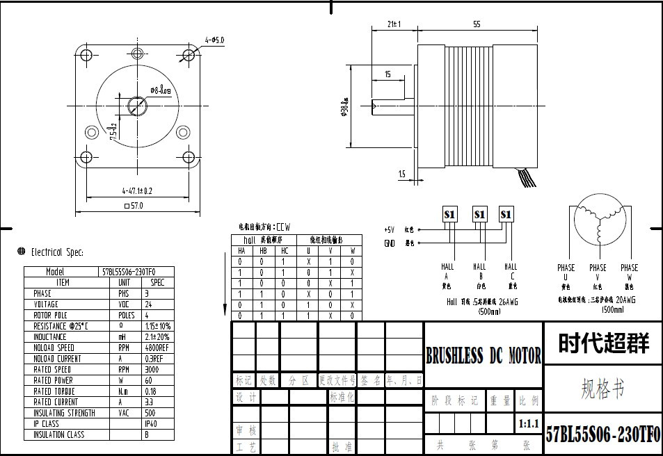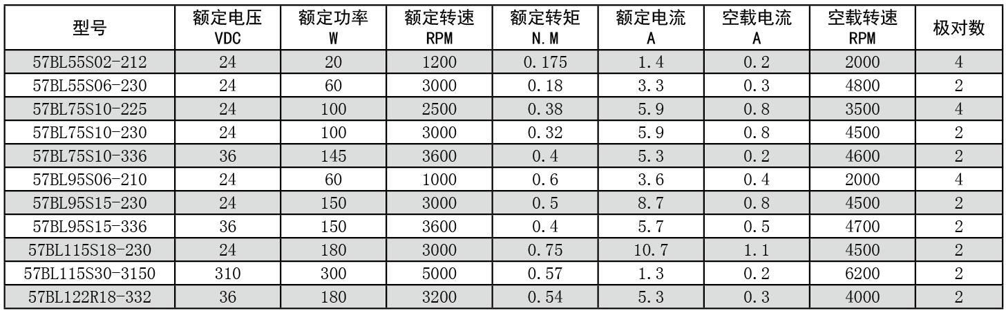 型號 | 額定電壓 V | 額定轉矩 N.M | 額定轉速 rpm | 額定功率 W | 額定電流 A | 級對數(shù) | 重量 KG | 57BL55S06-230TF9 | 24 | 0.18 | 3000 | 60 | 3.3 | 2 | 0.45 |