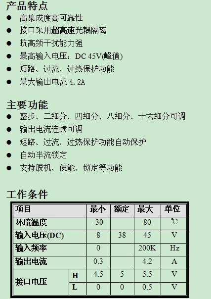 驅(qū)動器所用芯片:TB6600HQ\HG 【產(chǎn)品名稱】 TB6600HQ/HG東芝****上市產(chǎn)品 【產(chǎn)品類別】 步進電機 【產(chǎn)品用途】 步進電機驅(qū)動IC 【產(chǎn)品規(guī)格】 HZIP25 【生產(chǎn)廠家】 TOSHIBA 【產(chǎn)品說明】 PWM斬波型雙極性步進電機驅(qū)動器IC TB6600HQ/HG是一個單芯片PWM斬波型雙極性正弦步進電機微步驅(qū)動。 可控制2相步進電機正向和反向旋轉(zhuǎn), 帶有1-2相, W1 -2相2W1 -2相, 4W1 -2相勵磁模式。 只需時鐘脈沖信號就可以驅(qū)動兩相雙極型步進電機實現(xiàn)低振動,高效率工作。【產(chǎn)品特點】 •單芯片雙極性正弦微步步進電機驅(qū)動器 • ****BiCD 0.13 nm工藝 •高達50V耐壓 •導通電阻(上+下) = 0.4 Ω •正向和反向旋轉(zhuǎn)控制 •5種細分模式可選(1/1 ,1/2 ,1/4 ,1/8 , 1/16步) •輸出電流: IOUT = 5.0A(峰值,在100ms內(nèi) ) •額定輸出:IOUT = 4.5 A •封裝: HZIP25 - 1.00F •輸入口內(nèi)置下拉電阻: 100 KΩ •輸出報警管腳電流 :Ialert = 1mA •輸出監(jiān)視管腳( MO ):Imo= 1mA •帶有復位和使能引腳 •帶有待機功能。 •突破傳統(tǒng)的單電源供電 •內(nèi)置過熱保護( TSD )電路 •內(nèi)置的欠壓保護(UVLO)電路 •內(nèi)置過電流檢測( ISD),電路 鎖定模式下TB6600HQ/HG電流與電壓關系測試數(shù)據(jù)圖: 電源電壓38V時,可設在4.5A;