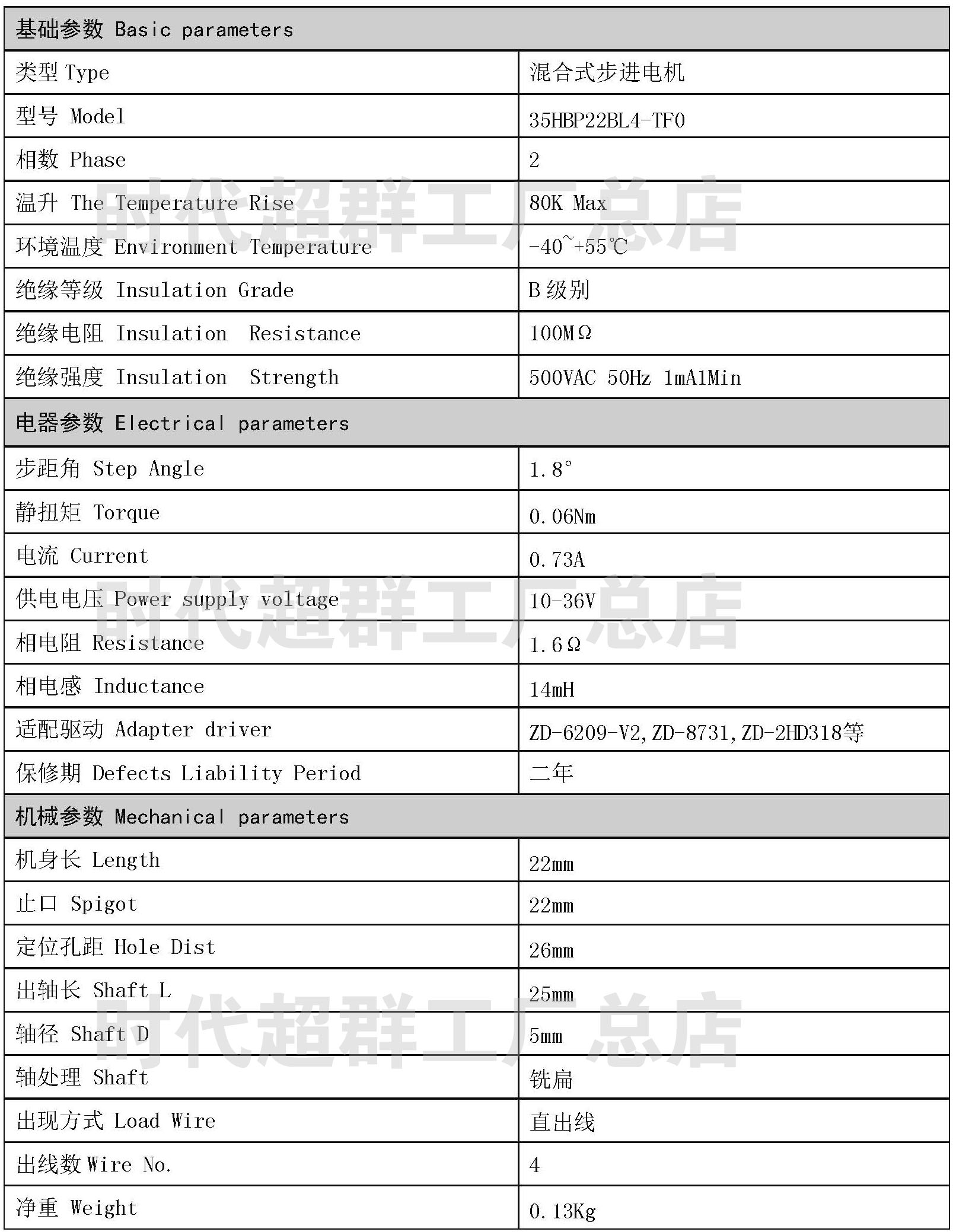 | 靜轉(zhuǎn)矩 Nm | 電壓VDC | 電流 A | 軸長 mm | 軸徑 mm | 重量 kg | | 35HBP22BL4-TF0 | 1.8 | 0.06 | 12 | 0.73 | 25 | 5 | 0.1 | | 35HBP27BL4-TF0 | 1.8 | 0.09 | 12 | 1.5 | 25 | 5 | 0.13 | | 35HBP44BL4-TF0 | 1.8 | 0.25 | 12 | 1 | 25 | 5 | 0.24