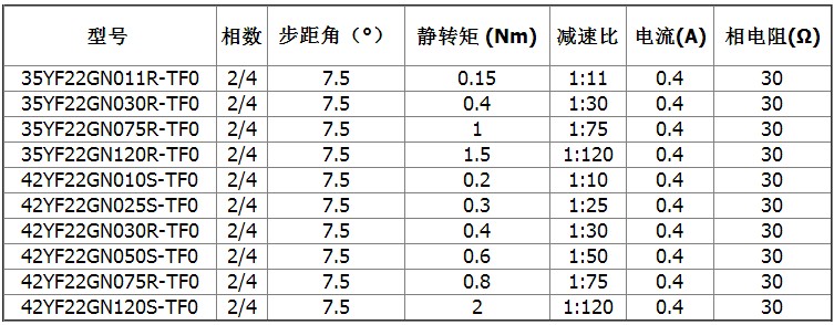 | 靜轉(zhuǎn)矩 (Nm) | 減速比 | 電流(A) | 相電阻(Ω) | 35YF22GN011R-TF0