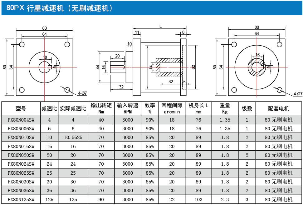 客戶額定轉速6000轉,那么搭配一款PX80N004SW行星減速機4速比,輸出額定轉速1500轉,在微調速度是比較合適的。此時輸出扭矩為0.47NM*4速比*80%效率=1.5NM<40NM(減速機額定輸出扭矩),能夠很大限度的滿足客戶扭矩需求。