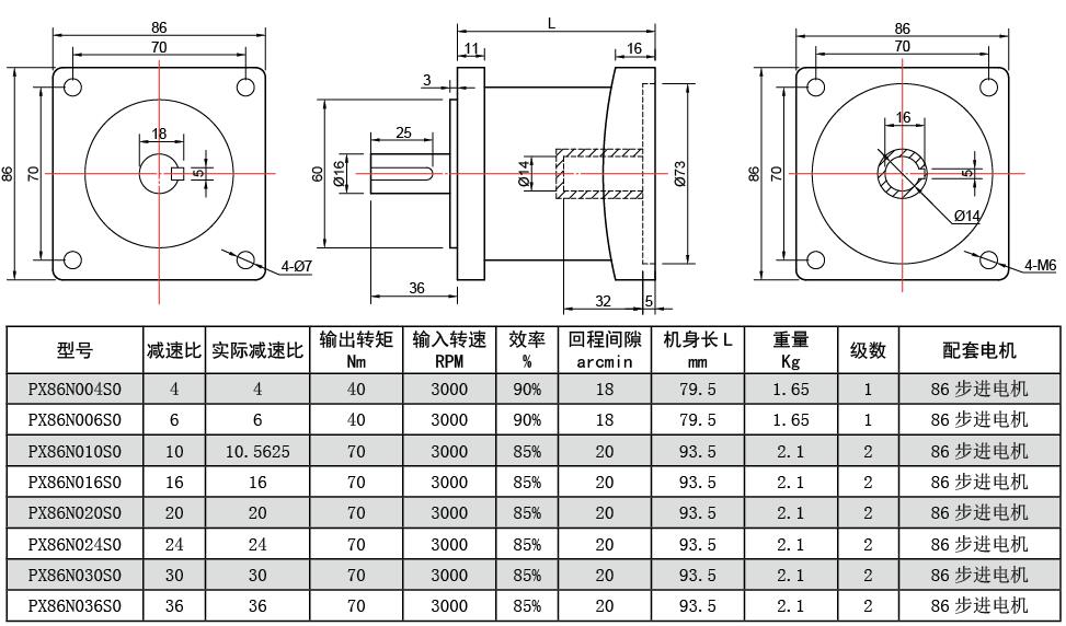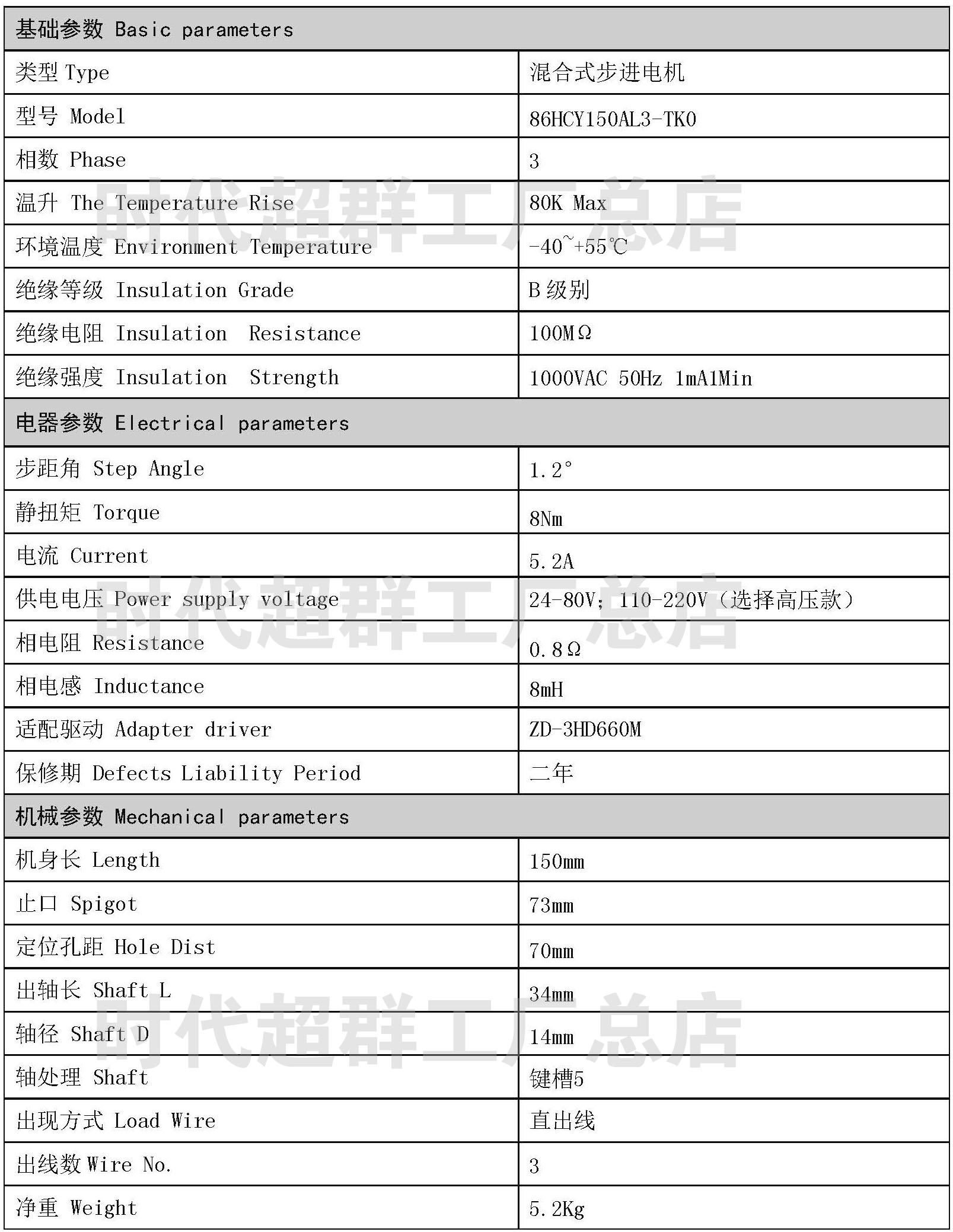 型號(hào) Model | 老型號(hào) old Model | 相數(shù) Phase | 步距角 Step Angle | 靜轉(zhuǎn)矩 Torque (Nm) | 電流 Current (A) | 相電阻 Resistance (Ω) | 相電感 Inductance (mH) | | 86HCY65AL3-TR0 | 86BYG350-65 | 3 | 1.2° | 2.0 | 3.0 | 0.2 | 1.6 | | 86HCY98AL3-TK0 | 86BYG350-98 | 3 | 1.2° | 4.5 | 5.2 | 0.5 | 3.0 | | 86HCY113AL3-TK0 | 86BYG350-113 | 3 | 1.2° | 6.0 | 5.2 | 0.4 | 5.9 | | 86HCY113AL3-DK0 | 86BYG350-113(雙出軸) | 3 | 1.2° | 6 | 5.2 | 0.6 | 11.0 | | 86HCY150AL3-TK0 | 86BYG350-150 | 3 | 1.2° | 7.0 | 5.2 | 0.8 | 8.0 |