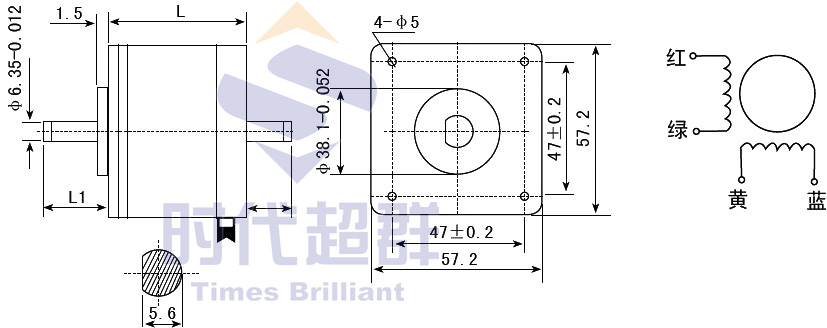 57HBP56AL4-DFA的雙出軸步進(jìn)電機(jī)步距角1.8°扭矩1.2NM,電流3A 止口38 孔距47 出軸長20\21、軸徑8\8 扁\圓。電機(jī)加一個(gè)手輪?梢允謩(dòng)控制導(dǎo)軌的移動(dòng),也可用電機(jī)自動(dòng)化控制。 具體電機(jī)尺寸圖如下: