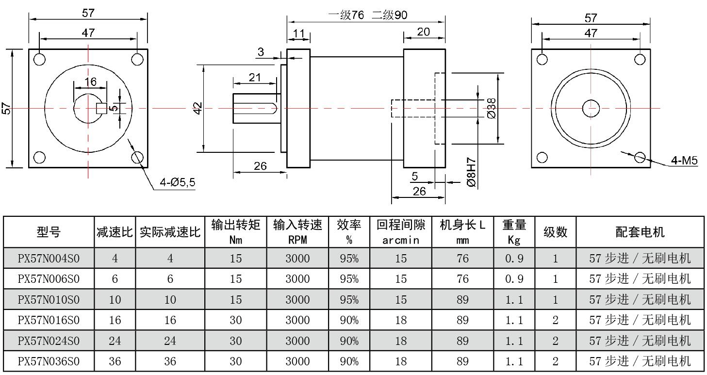 即t=9550p/n 式中: p—功率,kw; n—電機(jī)的額定轉(zhuǎn)速,r/min; t—轉(zhuǎn)矩,nm。 電機(jī)的輸出轉(zhuǎn)矩一定要大于工作機(jī)械所需要的轉(zhuǎn)矩,一般需要一個(gè)安全系數(shù) 根據(jù)如上計(jì)算得出:T=9550*0.16/3000=0.5NM 因此,這款電機(jī)再用到3000轉(zhuǎn)的時(shí)候能輸出0.5NM的力,那么調(diào)低轉(zhuǎn)速,扭矩就會(huì)相應(yīng)的降低。所以要根據(jù)實(shí)際情況選擇和是轉(zhuǎn)速,功率的電機(jī)。 在扭矩不夠的情況下,也可以加裝減速機(jī)。通過(guò)降低轉(zhuǎn)速來(lái)增加扭矩。下面推薦幾款可以搭配此款電機(jī)的減速機(jī)型號(hào)
