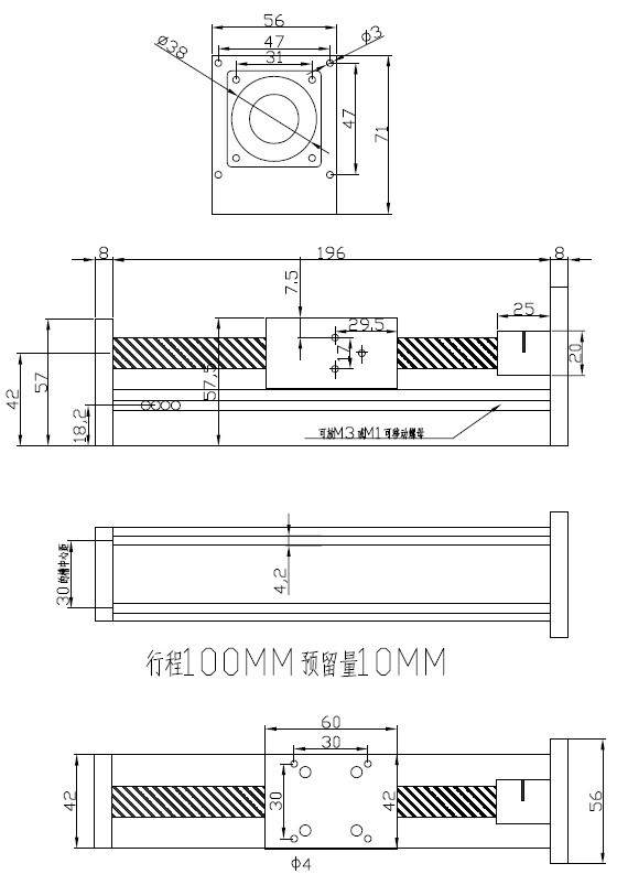 上圖為客戶特殊定做的CBX系列線性滾珠絲杠直線導(dǎo)軌滑臺(tái)水平載重30kg,垂直載重10kg,定位精度0.03MM,絲杠規(guī)格為1204滾珠絲杠,即12mm直徑,4mm導(dǎo)程,有效行程可做到1500mm,可做成1605、1610規(guī)格的滾珠絲杠。 常規(guī)產(chǎn)品尺寸圖如下: