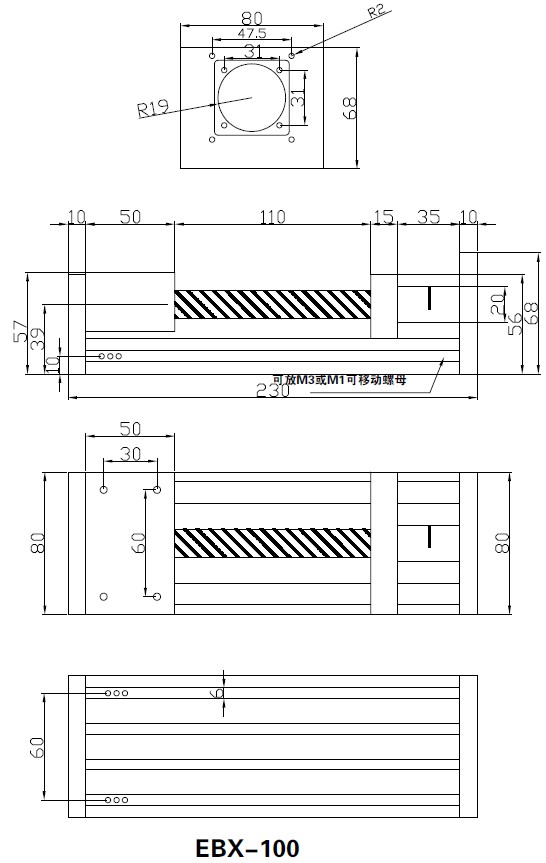 以上為常規(guī)EBX系列導(dǎo)軌尺寸圖,有效行程100MM,放余量10MM?筛鶕(jù)客戶要求定制。此系列導(dǎo)軌可以搭配普通的42/57步進電機,也可以搭配閉環(huán)步進電機,用于高速運作