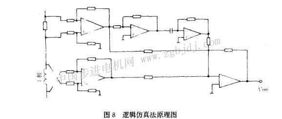 變壓器的初級線圈與定子繞組相串聯(lián),次級線圈的感應(yīng)電壓可寫成:  設(shè)計(jì)咒值和mi值使其滿足關(guān)系式nl=m1,則電壓v1可寫成:  這意味著1相中的反電勢可在兩個相連線圈的兩端重現(xiàn)。2相中的反電勢可同樣以v2 =nkcosnθ.θ形式檢測。 b.邏輯仿真法 邏輯仿真法是通過一個運(yùn)算放大器線路重現(xiàn)繞組中的反電勢,利用式(1)可以得到反電勢的表達(dá)式:  圖8所示的線路可仿真式(9)右邊的3項(xiàng),其輸出即為反電勢vim=ksinnθ·θ。  利用輔助線圈法和邏輯仿真法得到反電勢uim后,就可對反電勢波形進(jìn)行檢測。反電勢波形是一正弦波,利用過零比較器,對其正向過零點(diǎn)進(jìn)行檢測,產(chǎn)生脈沖,反饋到控制單 元,作為后續(xù)脈沖,就可形成閉環(huán)控制。 這種反電勢檢測形式的閉環(huán)控制,在低速運(yùn)行時是很難的,因此,在實(shí)際運(yùn)行時,需要開、閉環(huán)結(jié)合使用。 4.3利用反電勢電流檢測的步進(jìn)電動機(jī)閉環(huán)控制系統(tǒng) 檢測由繞組反電勢所引起的電流,從而進(jìn)行閉環(huán)控制,是一種線路比較簡單的閉環(huán) 控制方法。設(shè)i為電機(jī)一相繞組中的實(shí)際電流,is為堵轉(zhuǎn)時繞組中的電流,id為二者的差值,它是僅存在反電勢時,繞組中的電流,一般稱作反電勢電流。