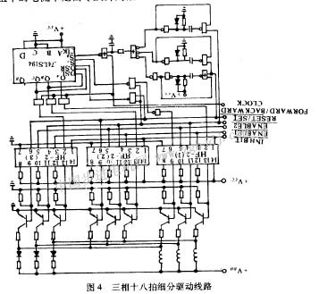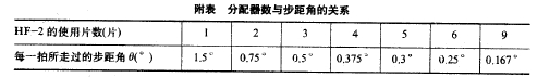 線路設(shè)計(jì)中的主要技巧是如何鋸決對(duì)驅(qū)動(dòng)脈沖起分配作用的移位寄存器74L S194的控制。從圖4可看到,當(dāng)ES ET/SET為“0”時(shí)(初始狀態(tài)的設(shè)定),74LS194的So和Si均為“l(fā)”。查真值表可知,74LS194將在其時(shí)鐘脈沖一種三相步進(jìn)電動(dòng)機(jī)的細(xì)分驅(qū)動(dòng)電路的作用下(對(duì)鐘脈沖利用R ES ET/SET從高電平變低的瞬變經(jīng)微分后形成)使QA、QB、Qc分別置成l、O、O,為移位寄存器向l號(hào)環(huán)形分配器輸送驅(qū)動(dòng)脈沖作準(zhǔn)備。但是環(huán)形分配器取用驅(qū)動(dòng)脈沖的上升沿;而74LS194取用驅(qū)動(dòng)脈沖的下降沿(經(jīng)倒相后解決與74LS194的配合),兩者相差半拍,這樣在驅(qū)動(dòng)脈沖的上升沿使相應(yīng)的環(huán)形分配器走過一步,而在驅(qū)動(dòng)脈沖下降沿的形成過程中使74LS194移過一位,為下一次驅(qū)動(dòng)脈沖分配作好準(zhǔn)備;陬愃频脑,當(dāng)方向位FORW ARD/BACKW ARD切換的時(shí)候,要預(yù)先使74LS194移過一步(移位方向由FORW ARD/BACKW ARD決定), 為此在線路中安排了將FORW ARD/BACKW ARD韻瞬變(包括上升沿與下降沿)產(chǎn)生一個(gè)寺供74LS194使用的時(shí)鐘脈沖。只是有一點(diǎn)要特別指出的,即要先準(zhǔn)備好移位條件,然后再產(chǎn)生時(shí)鐘脈沖,為此在時(shí)間上要有一點(diǎn)滯后,在線路中用RC延遲產(chǎn)生。 最后,由于步進(jìn)電動(dòng)機(jī)每一相電流是三個(gè)功率放大器共同作用的結(jié)果,當(dāng)一相繞組完全通電時(shí),三個(gè)功率放大器各提供三分之一的相電流,據(jù)此可以選擇適用的功率晶體管及限流電阻。由于新的線路設(shè)計(jì)方案的總功率與傳統(tǒng)線路相當(dāng),所以電動(dòng)機(jī)驅(qū)動(dòng)部分的體積并不一定比傳統(tǒng)線路更大。相反,由于單個(gè)功放電路的電流減小了(減至傳統(tǒng)線路的三分之一).所以功率管的選擇、功率管與分配器之間的匹配等更易得到解決。限流電阻也不崩選擇大瓦數(shù)的線繞電阻,可選用較小功率的線繞電阻。 3細(xì)分量的擴(kuò)展 利用圖4線路的設(shè)計(jì)原理,不難設(shè)計(jì)出其他小步距角的驅(qū)動(dòng)線路。HF-2環(huán)形分配器的使用數(shù)目與每一拍所移動(dòng)的角度關(guān)系如附表所示。