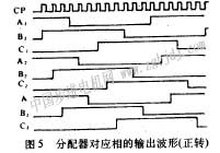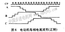 2三相十八拍細(xì)分電路 所謂細(xì)分電路,就是在控制電路上采取一定的措施把步進(jìn)電動(dòng)機(jī)的每一步再分得細(xì)一點(diǎn)。以三相步進(jìn)電動(dòng)機(jī)為例,如選用的電動(dòng)機(jī)的步距角為3度/1.5度(三相三拍工作時(shí)的步距角為3度,三相六拍工作時(shí)的步距角為1.5度),則采用三相十八拍的細(xì)分驅(qū)動(dòng)后,可使每一拍的驅(qū)動(dòng)步距減為0.5度。步進(jìn)電動(dòng)機(jī)在細(xì)分狀態(tài)下由于步距角變小,使轉(zhuǎn)子到達(dá)新的穩(wěn)定點(diǎn)上時(shí)所具有的功能也變小,從而振動(dòng)顯著減小。細(xì)分電路不但可以實(shí)現(xiàn)微量進(jìn)給,而且可以保持系統(tǒng)原有的快速性,也提高了步進(jìn)電動(dòng)機(jī)在低頻段運(yùn)行的平滑性。此外,采用細(xì)分電路后,電動(dòng)機(jī)繞組中的電流不是由零躍升到額定值,而是要經(jīng)過若干小步的變化才能達(dá)到額定值,所以繞組中的電流變化比較均勻。 圖4給出了以三片HF-2電路為核心構(gòu)成的三相十八拍細(xì)分驅(qū)動(dòng)線路。  圖4線路的關(guān)鍵在于三片HF-2電路 的時(shí)鐘脈沖通過一個(gè)移位寄存器進(jìn)行分配。輸入脈沖的第1、4、7……被接到l號(hào)分配器;輸入脈沖的第2、5、8.…“被接到2號(hào)分配器;輸入脈沖的3、6、9……被接到3號(hào)分配器,因此這三個(gè)分配器各對(duì)應(yīng)相的輸出波形依次要滯后一拍,見圖5所示。步進(jìn)電動(dòng)機(jī)每一組繞組的通電情況同事受到是是三個(gè)分配器對(duì)應(yīng)輸出端的控制。由于三個(gè)功率放大器的通電狀態(tài)在時(shí)間上有先后不同,因此電動(dòng)機(jī)每一相電流的波形就是三個(gè)功率放大器所提供驅(qū)動(dòng)電流的迭加,如圖6所示。