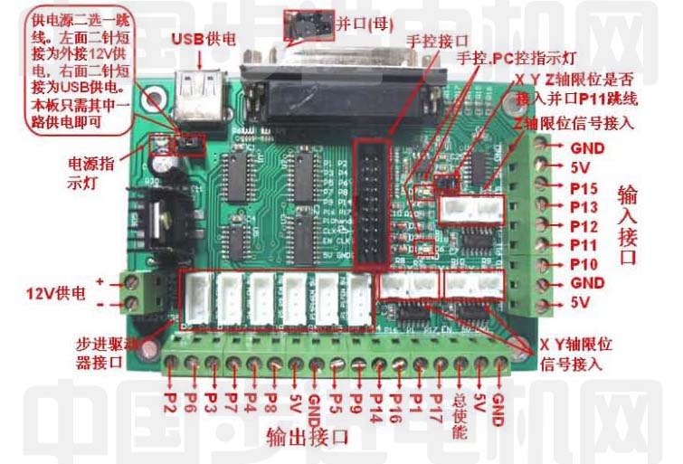 【接線及使用】 1 接口板通過并口共享線與Pc連接,接收上位機(jī)軟件的控制信號。 2. 12V供電輸入與uSB供電輸入 12V供電可接的電源電壓為范圍7、,一24V,當(dāng)接24V時,要注意觀寮7805~~,≈穩(wěn)壓芯片的溫度,推 薦接12V開關(guān)電源,12V供電與usB供電只需接路即可。 3 6軸步進(jìn)控制輸出端口