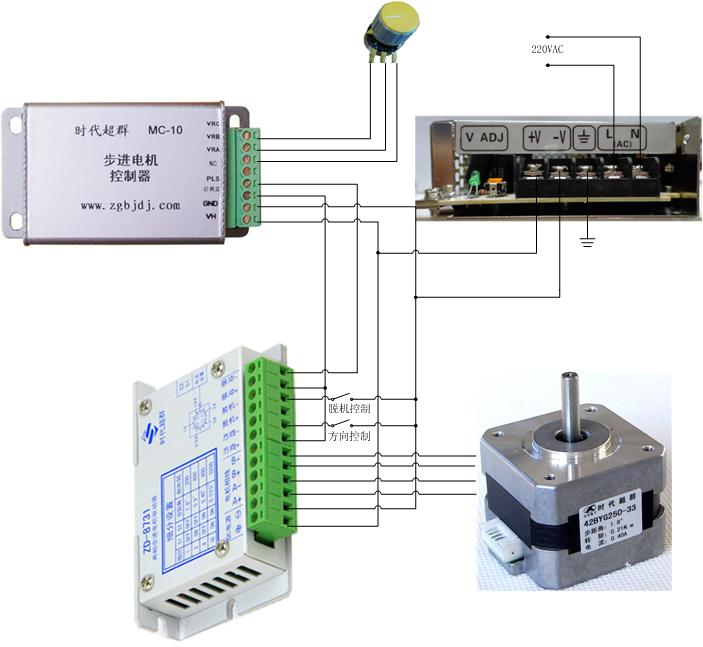1、用步進(jìn)電機(jī)42BYG250-33接在驅(qū)動(dòng)器ZD-8731上,控制器MC-10接在驅(qū)動(dòng)器,外接24V直流開(kāi)關(guān)電源(詳情見(jiàn)圖一)