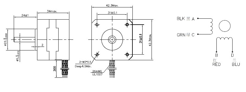 兩相步進電機42BYG2100-34(0.9°歩距角,0.22NM)