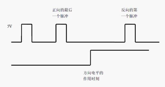 電機(jī)換向時(shí),一定要在電機(jī)降速停止后再換向。換向信號(hào)一定要在前一個(gè)方向的最后一個(gè)CP脈沖結(jié)束后以及下一個(gè)方向的第一個(gè)CP脈沖前發(fā)出。下圖所示為正向轉(zhuǎn)為反向時(shí)的控制過(guò)程: